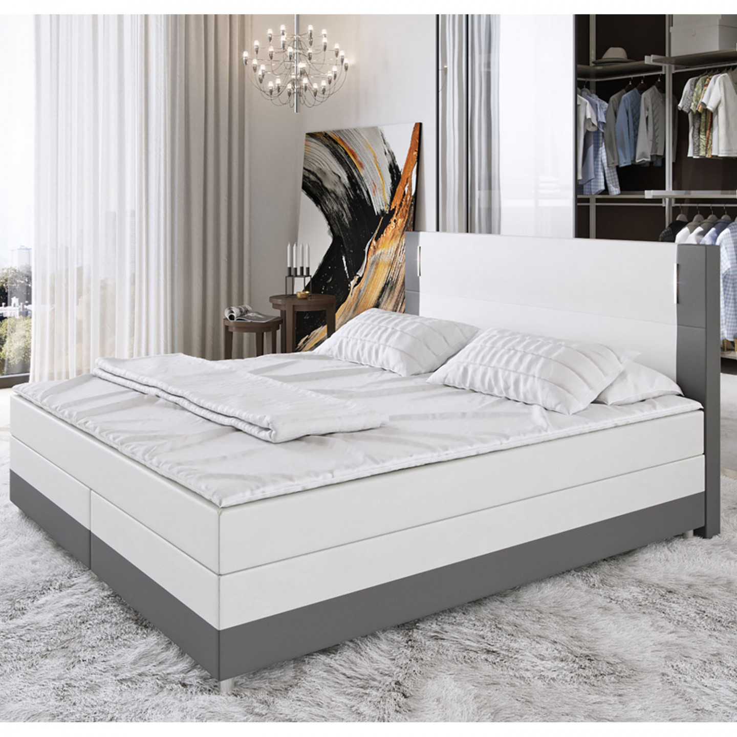 Pat boxspring american Denver cu iluminare LED 140 x 200 cm | alb / gri