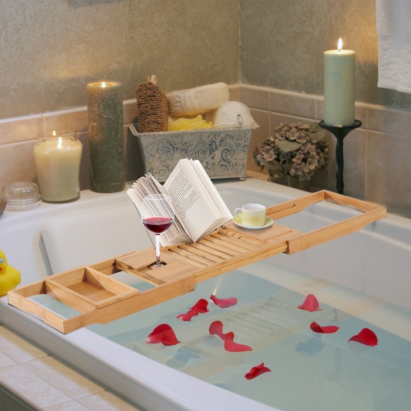 Tava de calitate înalta, fabricatadin bambus pentru o relaxare perfecta in cada cu spațiu de depozitare, loc pentru săpun, suport pentru carte si suport pentru un pahar de vin.Lungimeapoatefi reglabilaintre75 - 109 cm,deci este potrivitpentru căzilemai mari.