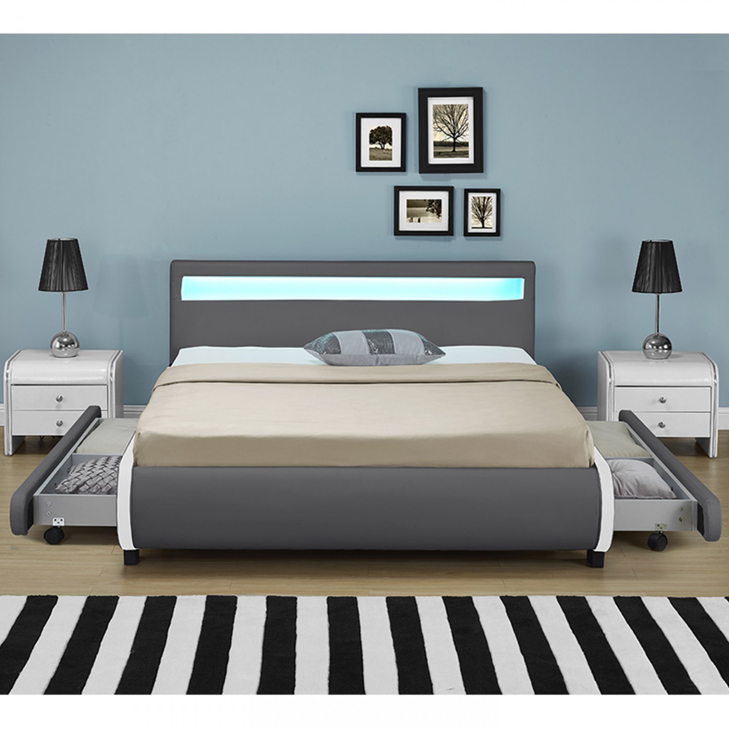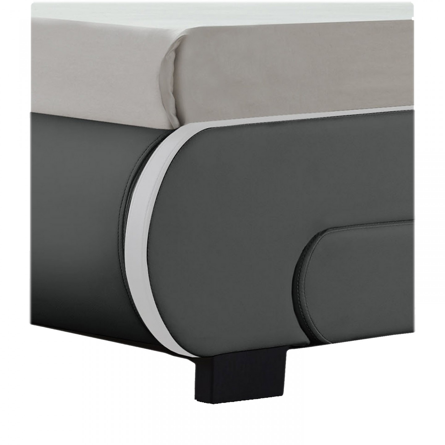 Pat modern tapițat cu piele, cu îngrijire simplă, vă va pregăti vise plăcute și un somn liniștit. Iluminarea LED instalată de-a lungul tăbliei oferă o lumină plăcută și extinde un farmec cu totul special dormitorului. Puteți controla lumina de la distanță și regla luminozitatea și culoarea în funcție de dispoziție.