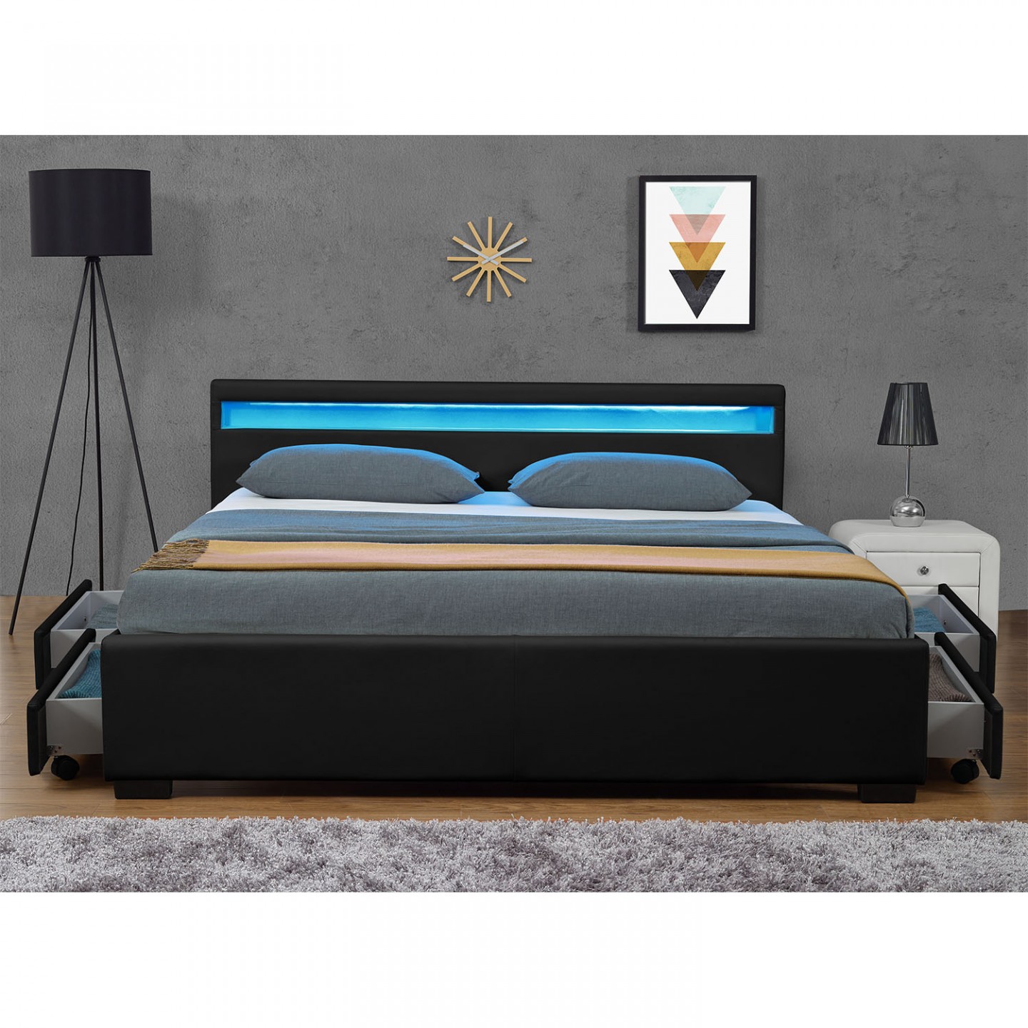 Pat modern tapițat cu piele, cu îngrijire simplă, vă va pregăti vise plăcute și un somn liniștit. Iluminarea LED instalată de-a lungul tăbliei oferă o lumină plăcută și extinde un farmec cu totul special dormitorului. Puteți controla lumina de la distanță și regla luminozitatea și culoarea în funcție de dispoziție.