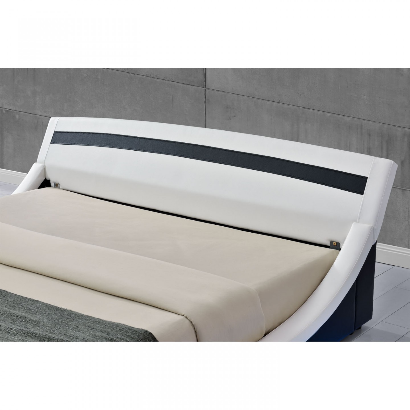 Pat modern tapițat cu piele, cu îngrijire simplă, vă va pregăti vise plăcute și un somn liniștit. Iluminarea LED instalată de-a lungul liniei laterale a patului oferă o lumină plăcută și extinde un farmec cu totul deosebit dormitorului. Puteți controla lumina de la distanță și regla luminozitatea și culoarea în funcție de dispoziție.