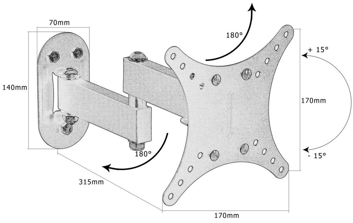 Acest suport Mounty® este, datorita dimensiunilor si greutății, universal. Poate fi folosit pentru monitoare LCD sau televizoare cu diagonală 30". După testarea TÜV SÜD GS este recomandata greutatea pana 12 kg. Pentru poziționarea corecta, este inclus in pachet un nivel cu bula de aer. Pachetul mai conține accesorii de montare dopuri, șuruburi, șaibe. Sunt folosite șuruburi de calitate înalta 8. 8.