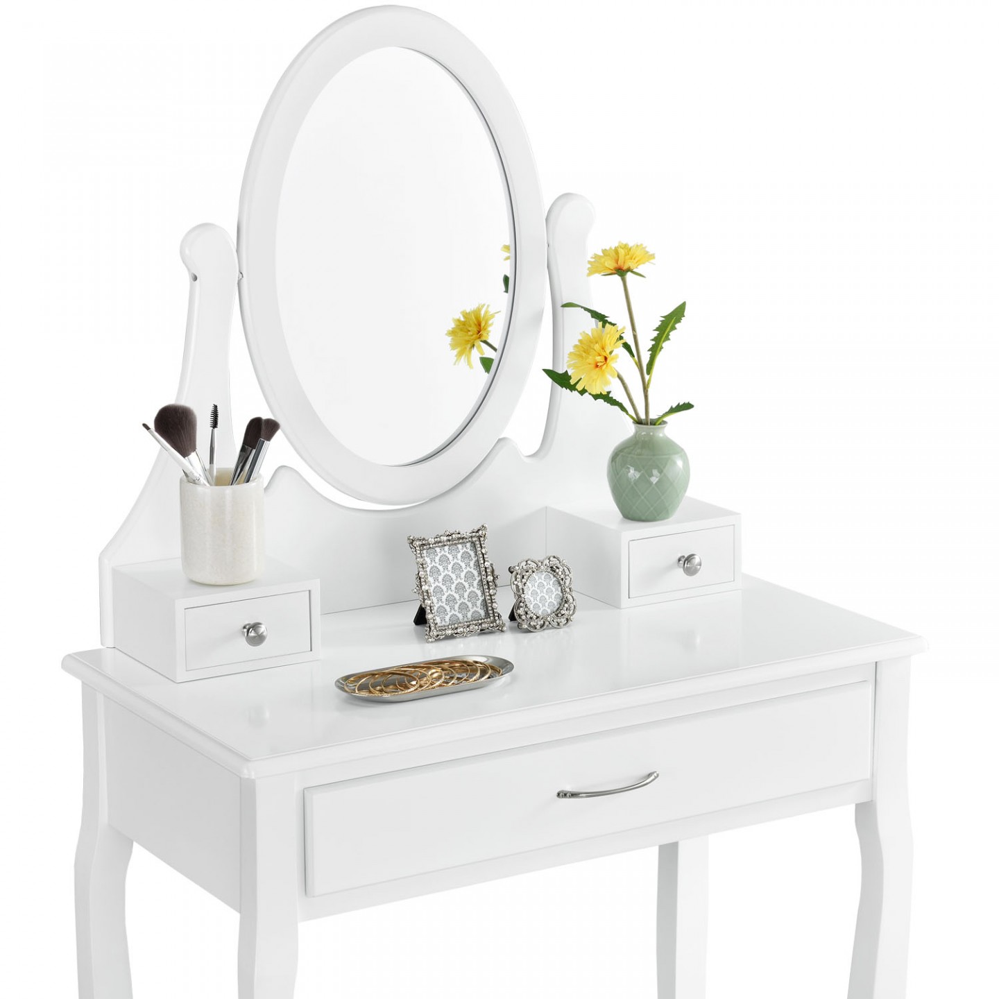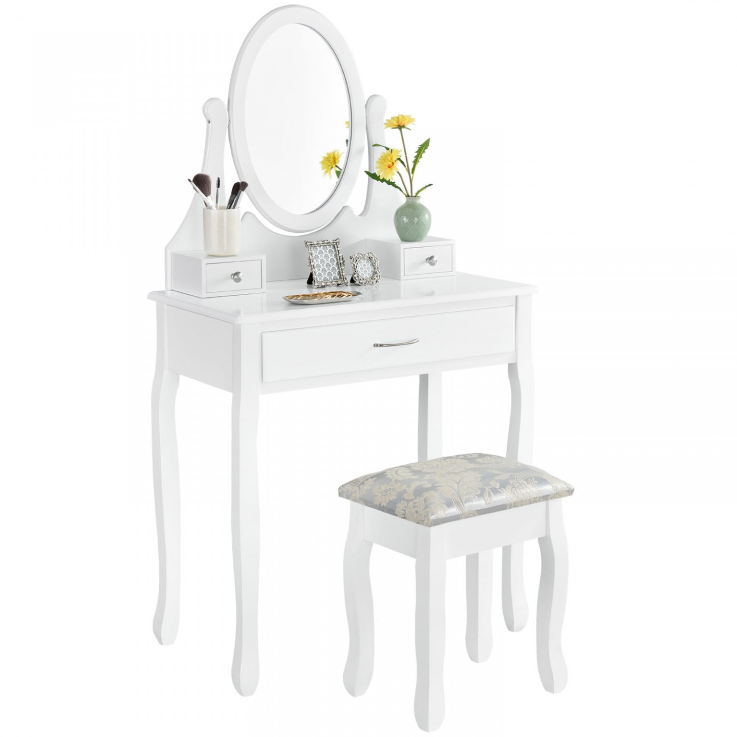 Accesoriu practic și original pentru interiorul fiecărui dormitor. Creează-ți un loc pentru ritualul zilnic de frumusețe! Simțiți-vă ca o prințesă sau o regină cu această masă vintage fabuloasă. Găsiți toate gadgeturile cosmetice, parfumuri, perii de par și bijuterii, cu o oglindă ovală și patru sertare. Obțineți o imagine de ansamblu și ordonați-vă în lucrurile voastre și, în special, într-un loc care vă va aparține numai dvs! Pentru că fiecare doamnă are nevoie de un moment pentru ea însăși. Nu mai împărtășiți spațiul dvs. de baie cu alți membri ai gospodăriei - veți găsi un asistent excelent în dressingul practic cu depozitare, oglindă și taburet confortabilă.