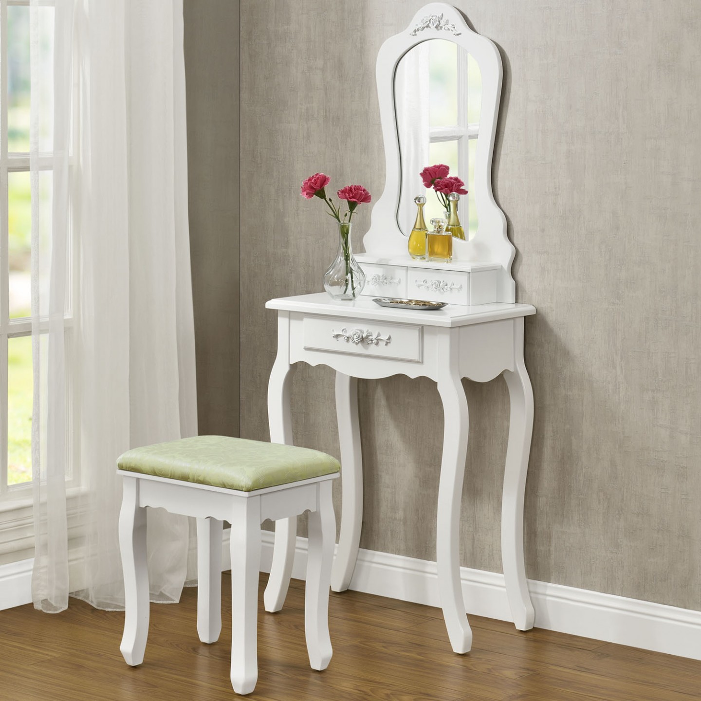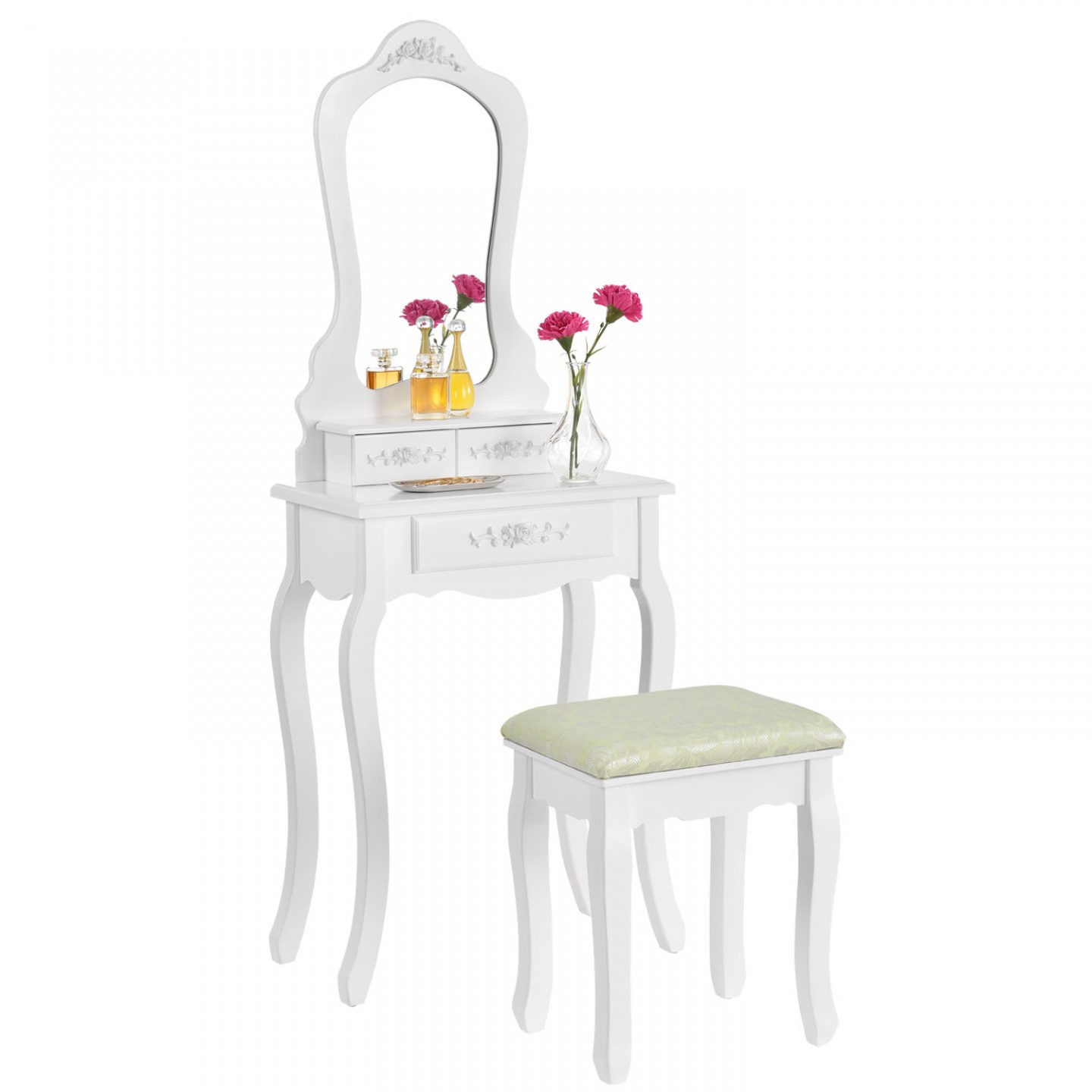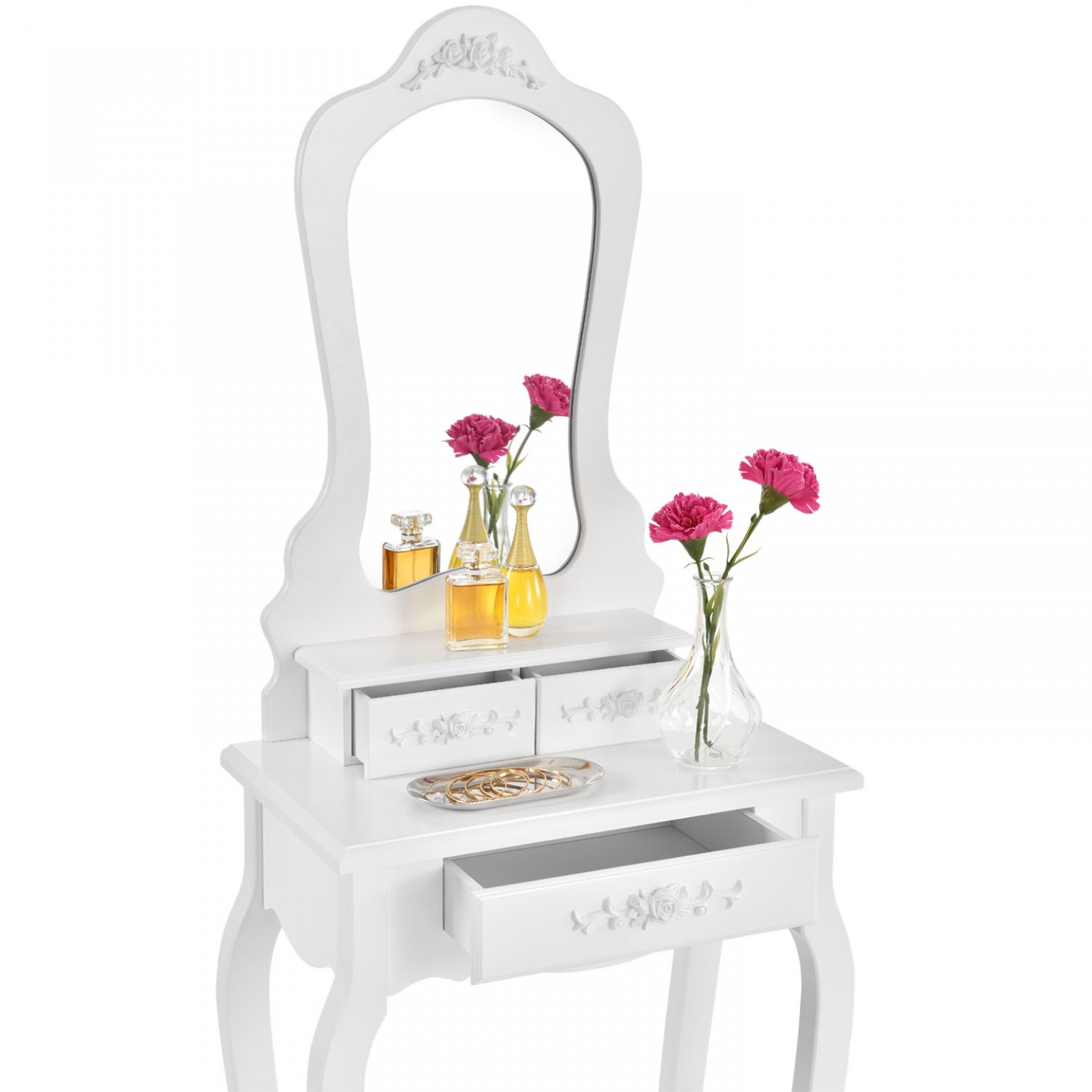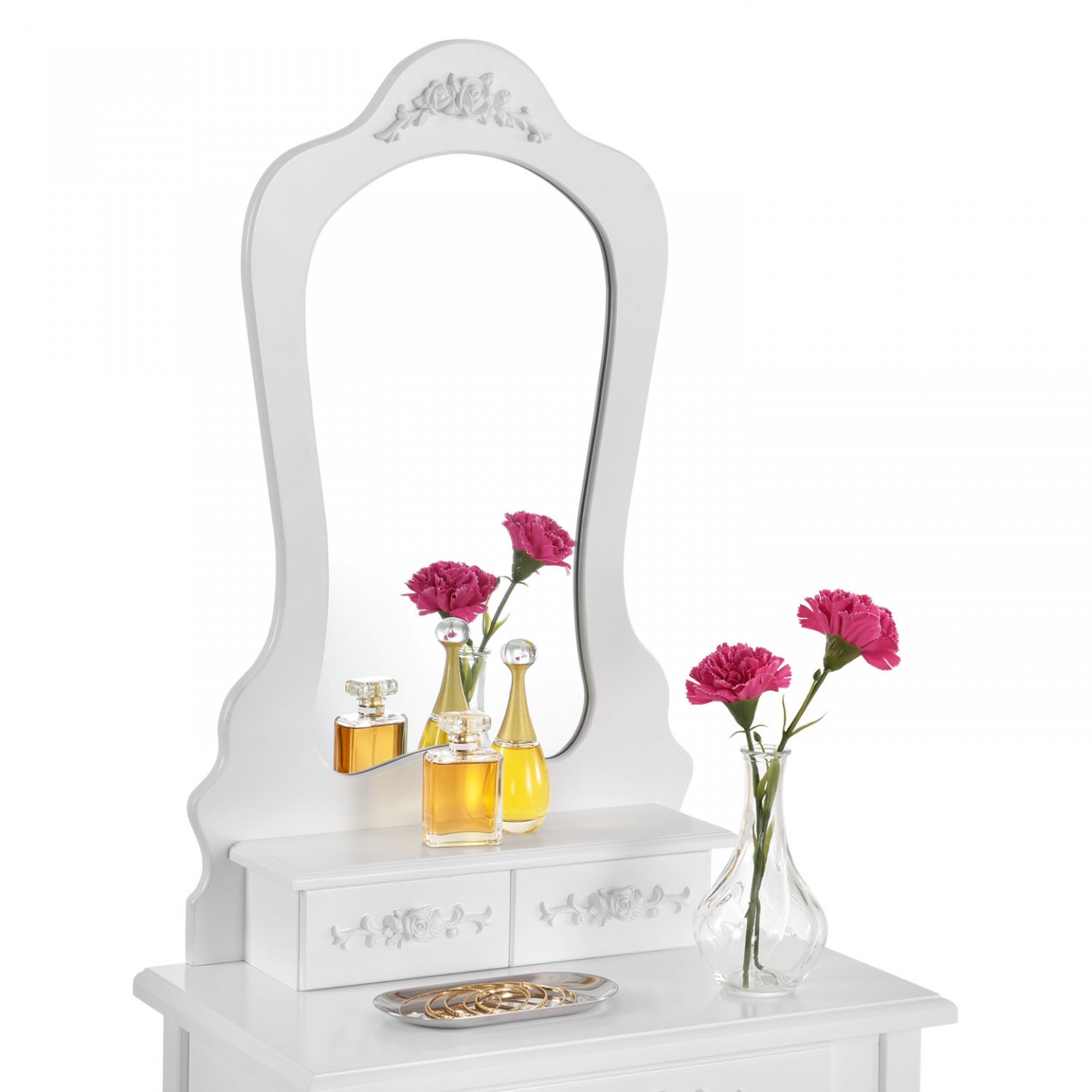 Accesoriu practic și original pentru interiorul fiecărui dormitor. Creează-ți un loc pentru ritualul zilnic de frumusețe! Simțiți-vă ca o prințesă sau o regină cu această masă vintage fabuloasă. Găsiți toate gadgeturile cosmetice, parfumuri, perii de par și bijuterii, cu o oglindă ovală și patru sertare. Obțineți o imagine de ansamblu și ordonați-vă în lucrurile voastre și, în special, într-un loc care vă va aparține numai dvs! Pentru că fiecare doamnă are nevoie de un moment pentru ea însăși. Nu mai împărtășiți spațiul dvs. de baie cu alți membri ai gospodăriei - veți găsi un asistent excelent în dressingul practic cu depozitare, oglindă și taburet confortabilă.